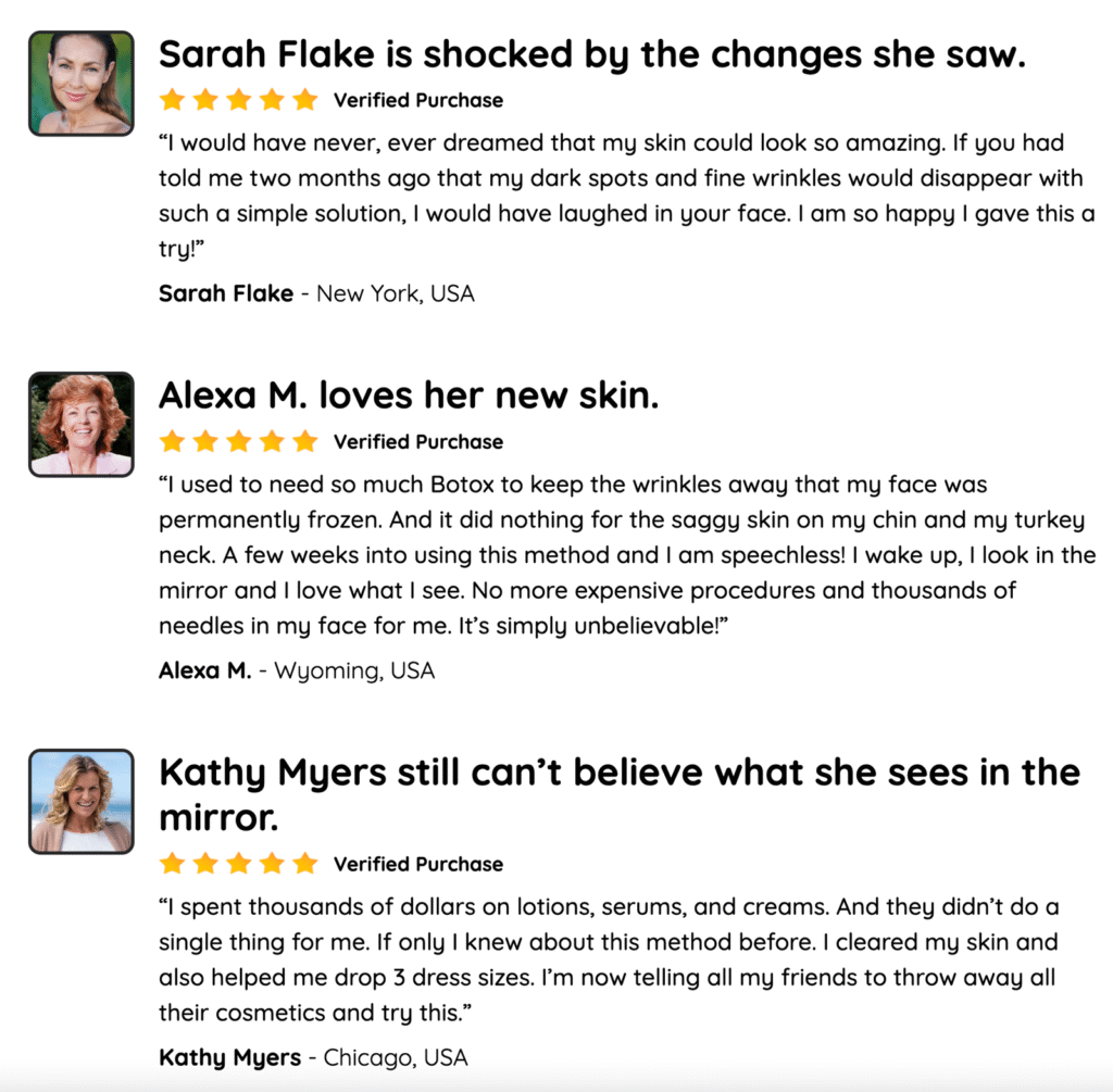 “I used to need so much Botox to keep the wrinkles away that my face was permanently frozen. And it did nothing for the saggy skin on my chin and my turkey neck. A few weeks into using this method and I am speechless! I wake up, I look in the mirror and I love what I see. No more expensive procedures and thousands of needles in my face for me. It’s simply unbelievable!”